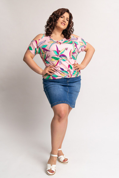 Női póló. Kivágott vállrésszel. Lezser fazon. Alja gumírozott. Nyomott mintával díszített.