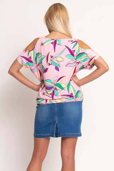 Női póló. Kivágott vállrésszel. Lezser fazon. Alja gumírozott. Nyomott mintával díszített.