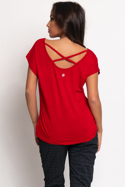 Női póló. Hátán keresztezett pántokkal. Nyomott mintával díszített.