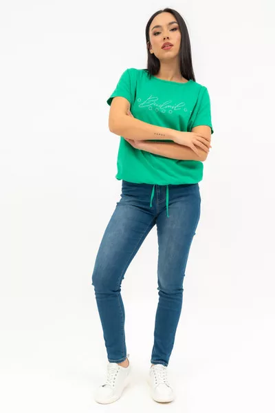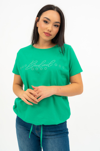Női póló kivágott vállrésszel. Lezser fazon . Nyomott mintával és strasszokkal díszített.