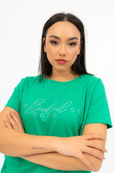 Női póló kivágott vállrésszel. Lezser fazon . Nyomott mintával és strasszokkal díszített.