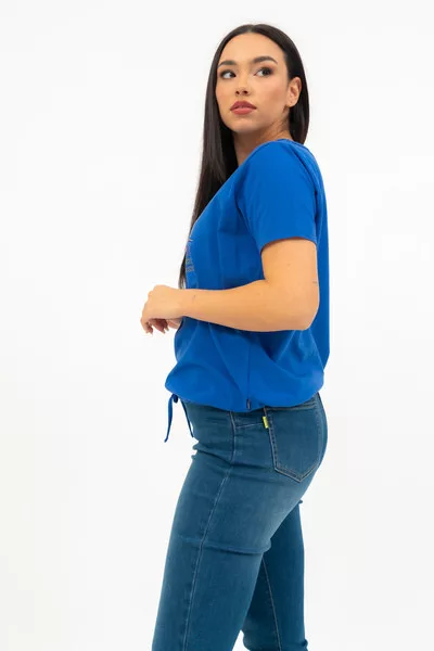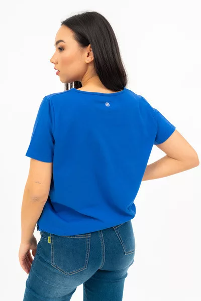 Női póló kivágott vállrésszel. Lezser fazon . Nyomott mintával és strasszokkal díszített.