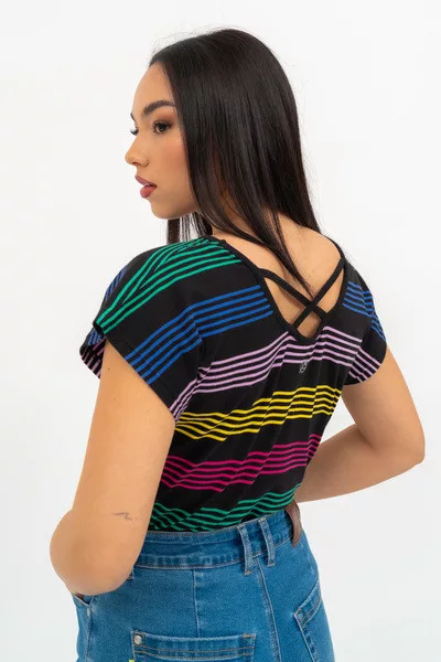 Női póló . Lezser fazon . Hátán keresztezett pántokkal. Nyomott mintával díszített.