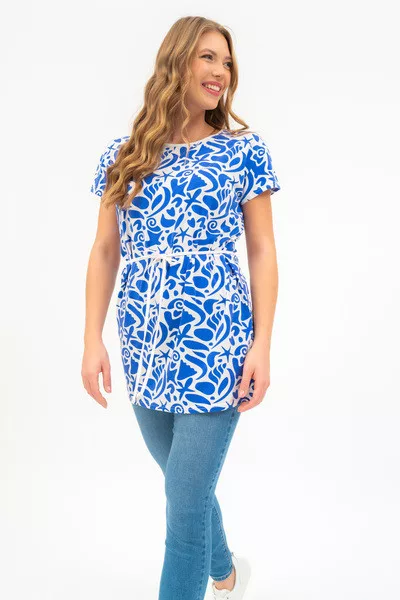 Női hosszított póló . Lezser fazon . Derekán övvel. Nyomott mintával díszített.