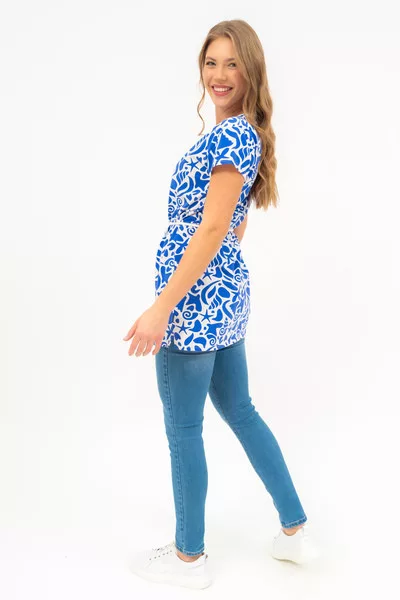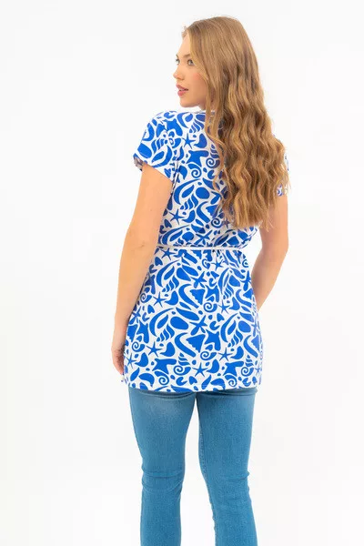 Női hosszított póló . Lezser fazon . Derekán övvel. Nyomott mintával díszített.