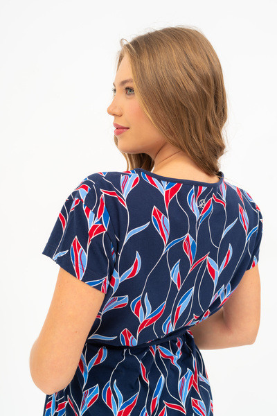 Női hosszított póló . Lezser fazon . Derekán övvel. Nyomott mintával díszített.