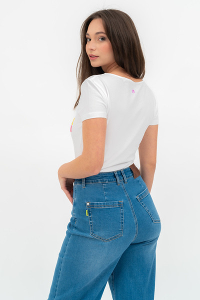 Női póló . Karcsúsított fazon . Nyomott mintával díszített.