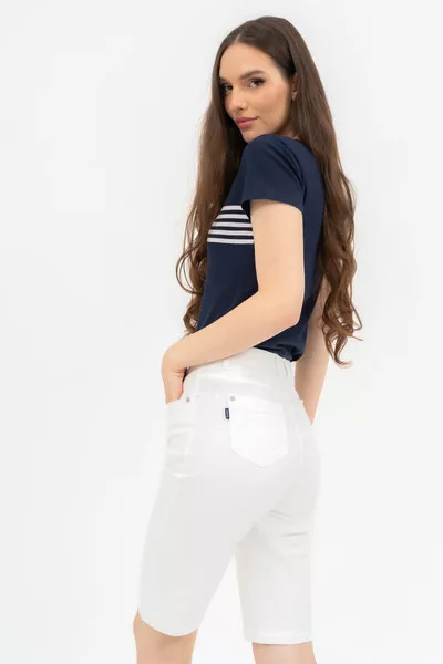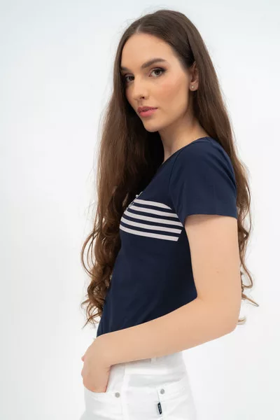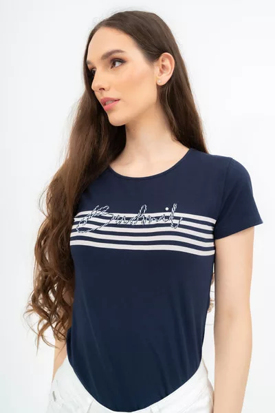 Női póló . Karcsúsított fazon . Nyomott mintával és rátéttel díszített.