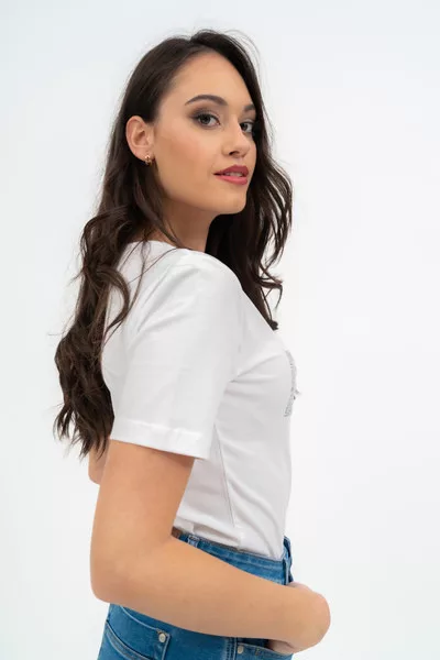 Női póló . Karcsúsított fazon . Strasszokkal díszített.