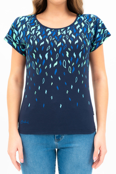 Női póló . Enyhén karcsúsított fazon . Nyomott mintával díszített.