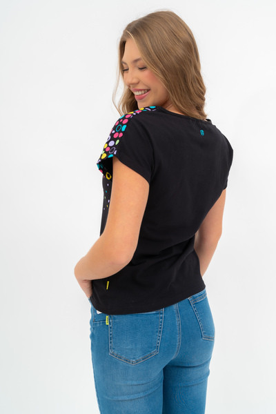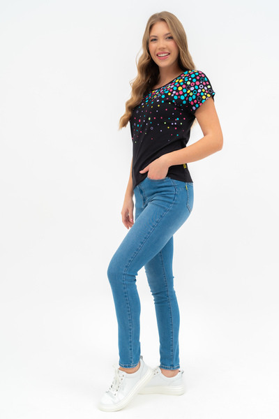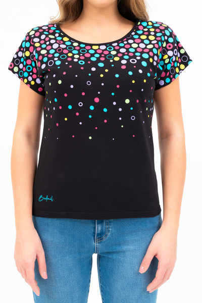 Női póló . Enyhén karcsúsított fazon . Nyomott mintával díszített.