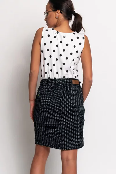 Női trikó. Karcsúsított fazon. Fémcímkével és nyomott mintával díszített.