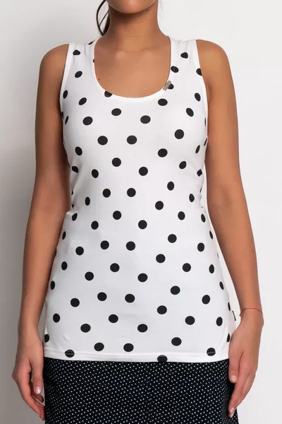 Női trikó. Karcsúsított fazon. Fémcímkével és nyomott mintával díszített.