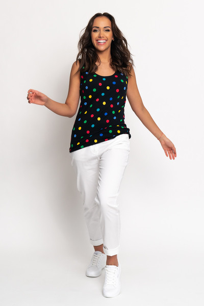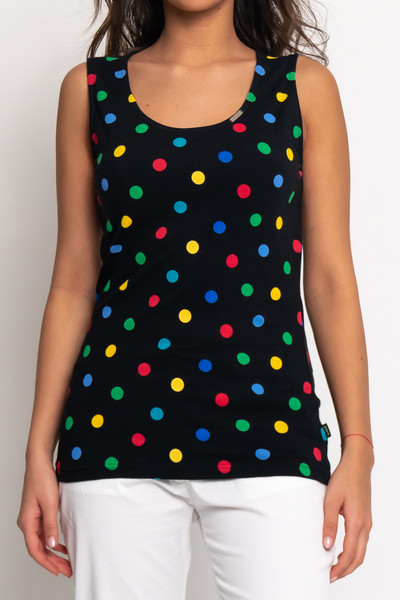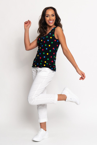Női trikó. Karcsúsított fazon. Fémcímkével és nyomott mintával díszített.