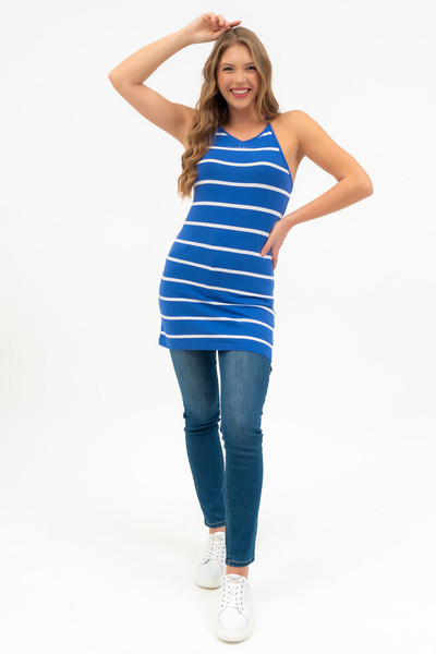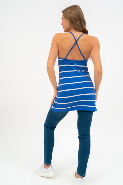 Női hosszított fazonú pántos felső. Karcsúsított fazon. Nyomott mintával díszített.
