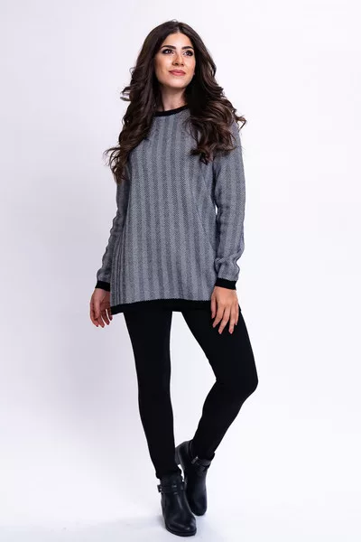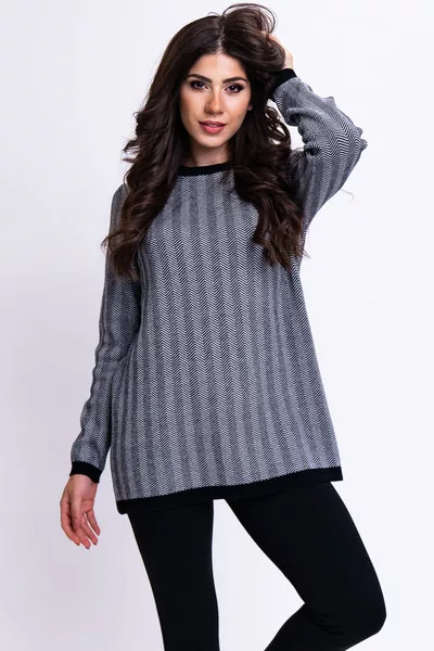 Női vékony kötött, pulóver. Belekötött cikcakkos mintával. Lezser fazon. Fémcímkékkel díszített.