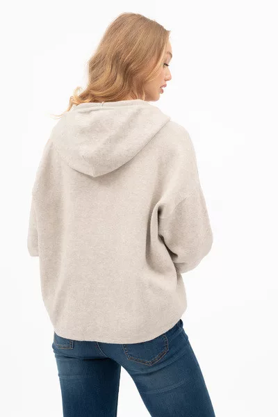 Női vékony kötött kapucnis pulóver. Lezser fazon. Fémcímkével díszítve.