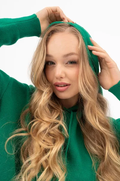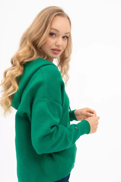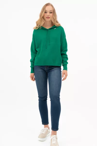 Női vékony kötött kapucnis pulóver. Lezser fazon. Fémcímkével díszítve.