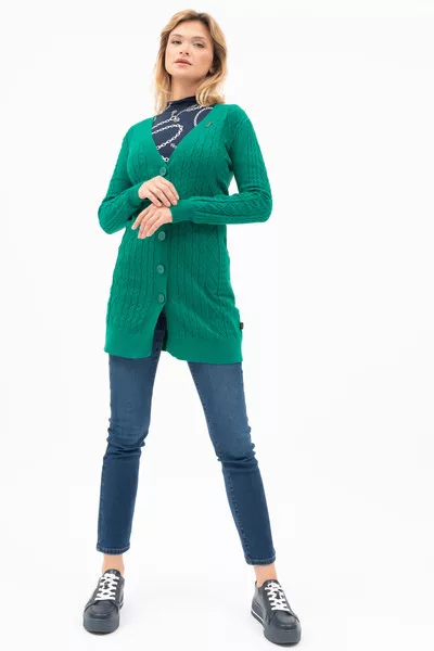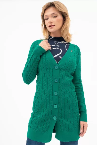Női vékony kötött kardigán. Egyenes fazon. Fémcímkével díszítve.