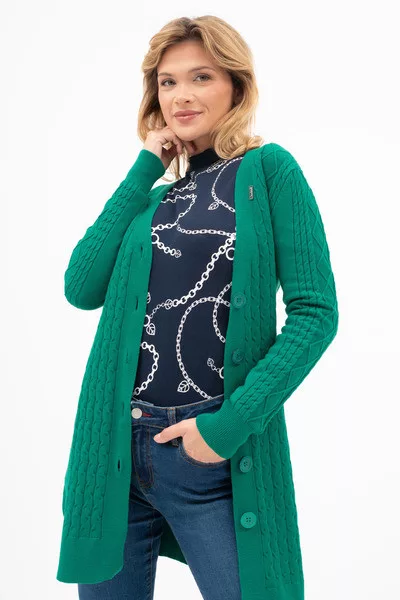 Női vékony kötött kardigán. Egyenes fazon. Fémcímkével díszítve.