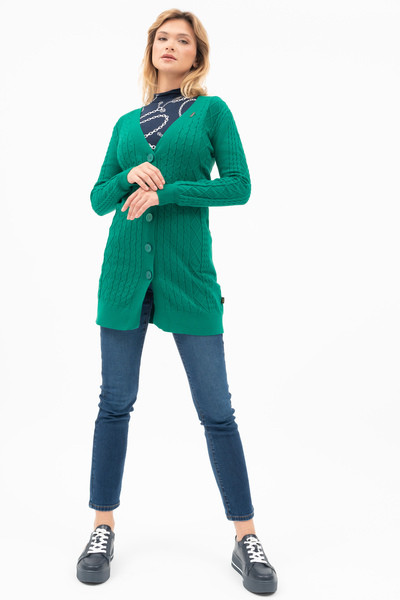Női vékony kötött kardigán. Egyenes fazon. Fémcímkével díszítve.