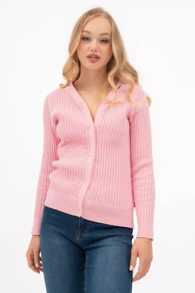Női vékony kötött kardigán. Szűkített fazon. Fémcímkével díszítve.