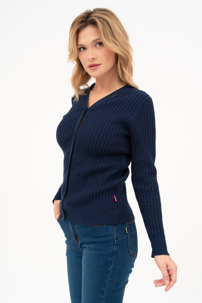 Női vékony kötött kardigán. Szűkített fazon. Fémcímkével díszítve.