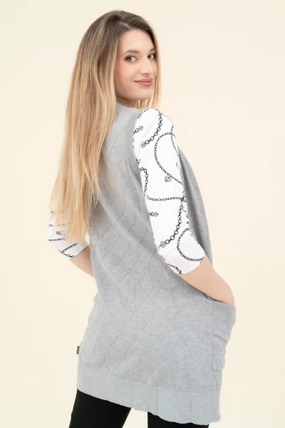 Női vékony kötött mellény. Egyenes fazon. Fémcímkével díszítve.