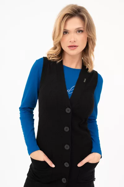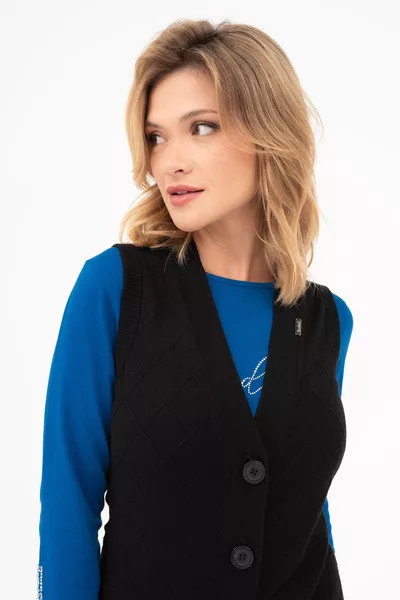 Női vékony kötött mellény. Egyenes fazon. Fémcímkével díszítve.