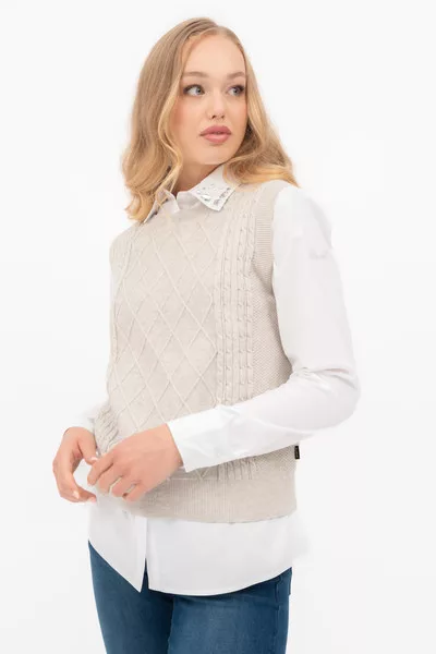 Női vékony kötött mellény. Egyenes fazon. Fémcímkével díszítve.