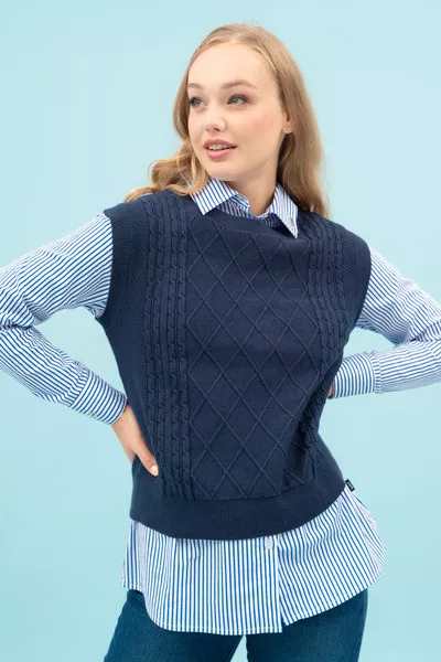 Női vékony kötött mellény. Egyenes fazon. Fémcímkével díszítve.