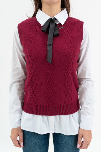Női vékony kötött mellény. Enyhén szűkített fazon. Fémcímkével díszítve.