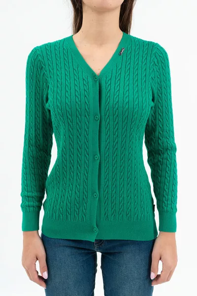 Női vékony kötött kardigán. Szűk fazon. Fémcímkével díszítve.