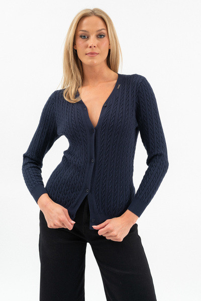 Női vékony kötött kardigán. Szűk fazon. Fémcímkével díszítve.
