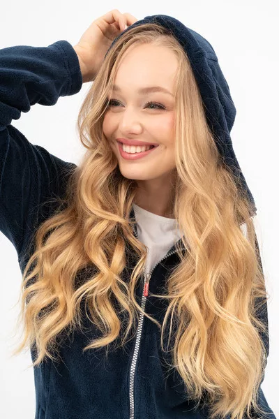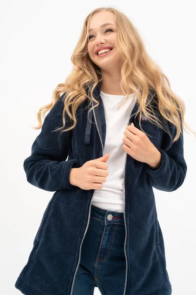 Női kapucnis polár felső. Szövött címkével díszítve.