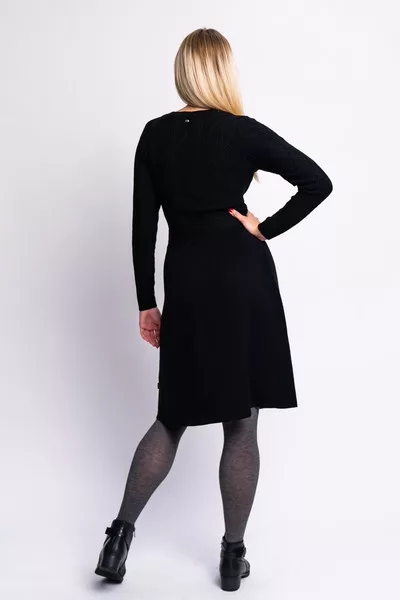 Női vékony kötött, csavart mintás ruha. Szoknyarésze A vonalú. Fémcímkékkel díszített.