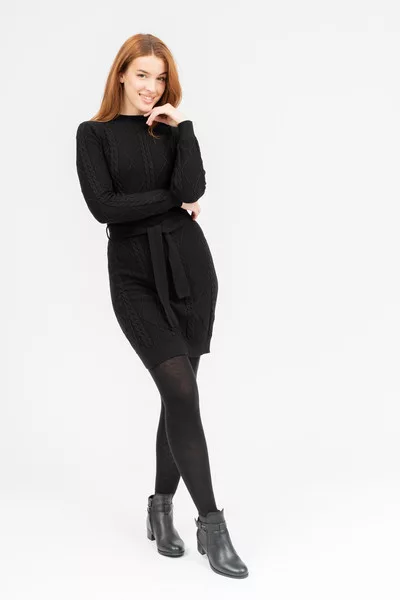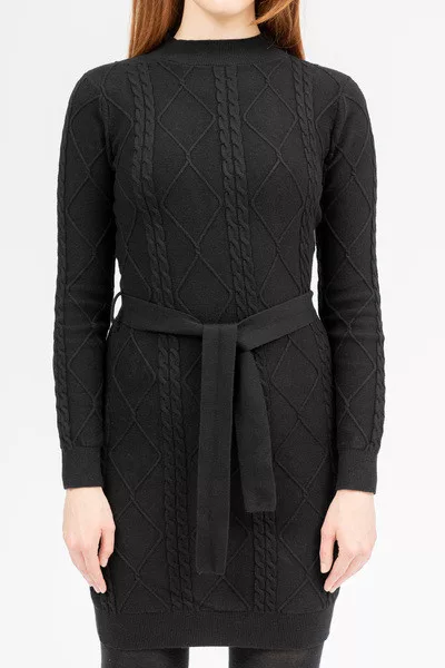Női kötött ruha. Karcsúsított fazon. Derekán övvel. Fémcímkékkel díszítve.