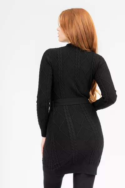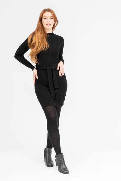 Női kötött ruha. Karcsúsított fazon. Derekán övvel. Fémcímkékkel díszítve.