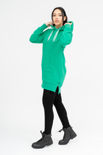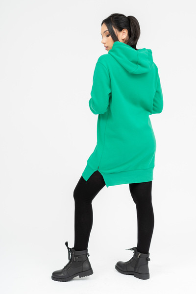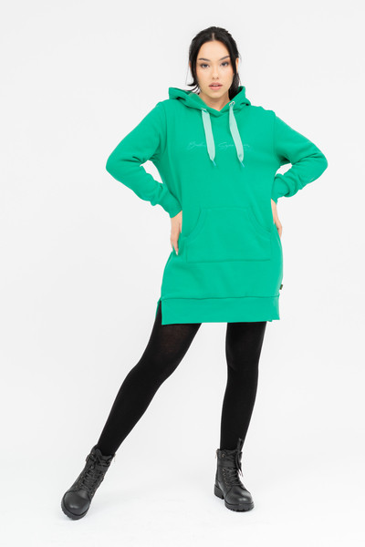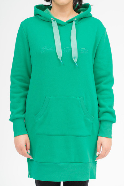 Női kapucnis ruha. Anyaga belül plüss. Lezser fazon. Hímzésekkel díszítve.