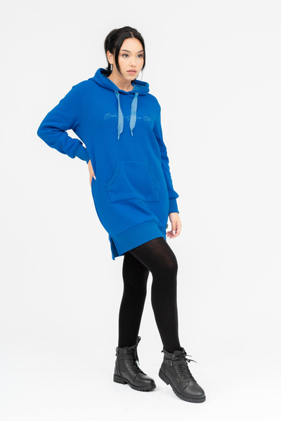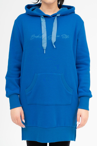 Női kapucnis ruha. Anyaga belül plüss. Lezser fazon. Hímzésekkel díszítve.