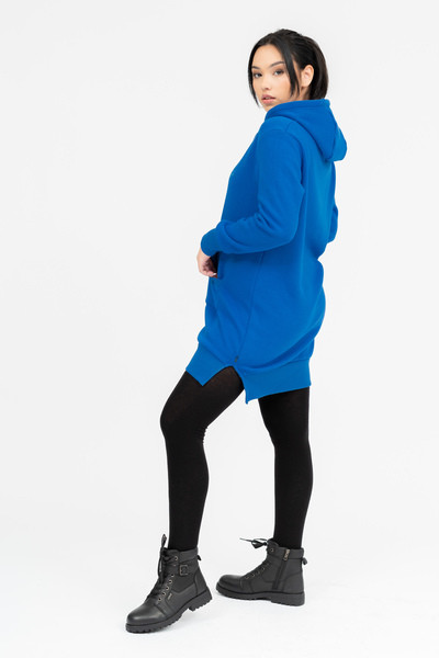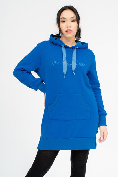 Női kapucnis ruha. Anyaga belül plüss. Lezser fazon. Hímzésekkel díszítve.