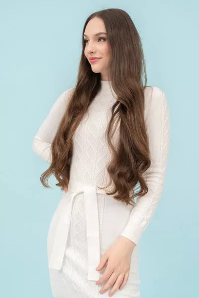 Női vékony kötött ruha. Szűk fazon. Derekán öv. Fémcímkével díszítve.
