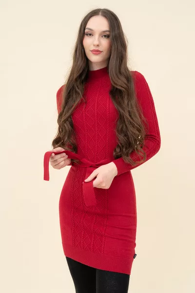 Női vékony kötött ruha. Szűk fazon. Derekán öv. Fémcímkével díszítve.