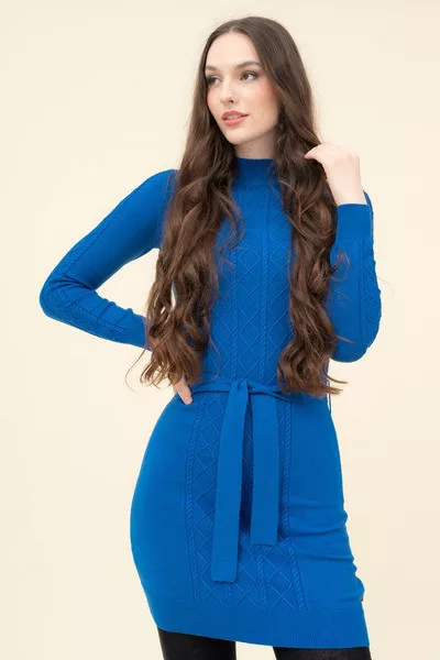 Női vékony kötött ruha. Szűk fazon. Derekán öv. Fémcímkével díszítve.