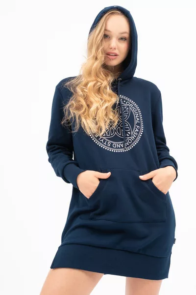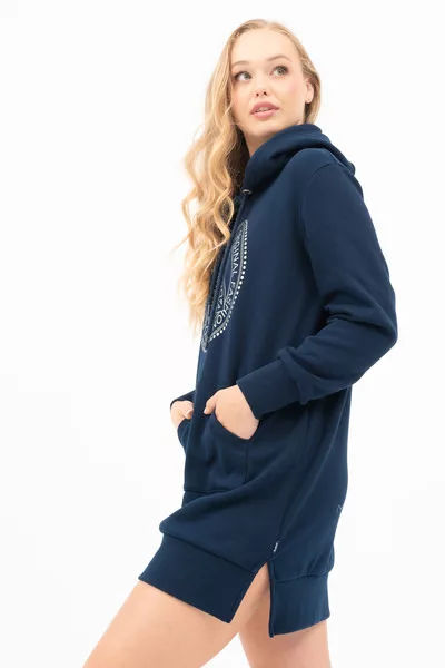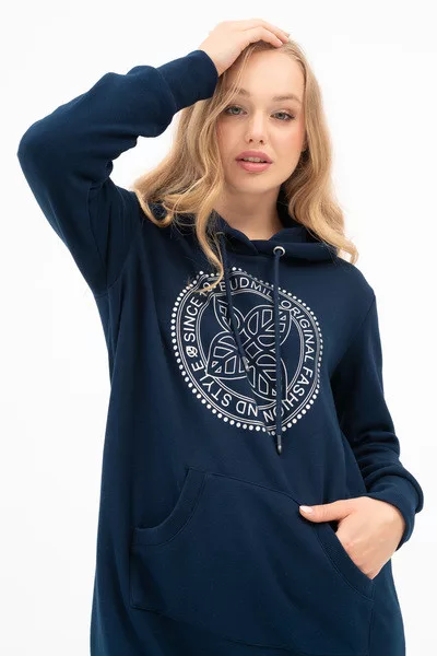 Női kapucnis ruha. Alapanyaga belül plüss. Lezser fazon. Nyomott mintával díszítve.