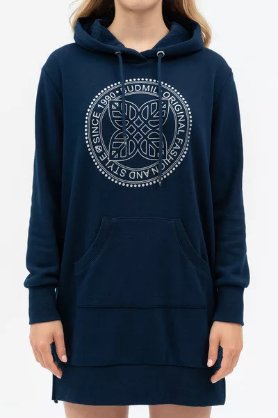 Női kapucnis ruha. Alapanyaga belül plüss. Lezser fazon. Nyomott mintával díszítve.