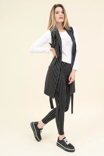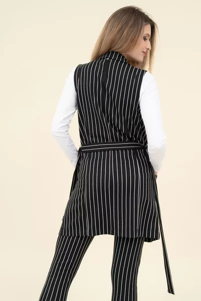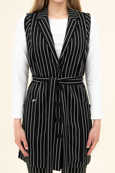 Női hosszított mellényruha rugalmas anyagból. Szűkített fazon. Derekán öv. Fémcímkével díszítve.