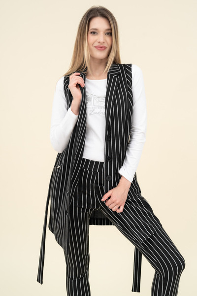 Női hosszított mellényruha rugalmas anyagból. Szűkített fazon. Derekán öv. Fémcímkével díszítve.