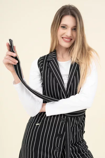 Női hosszított mellényruha rugalmas anyagból. Szűkített fazon. Derekán öv. Fémcímkével díszítve.