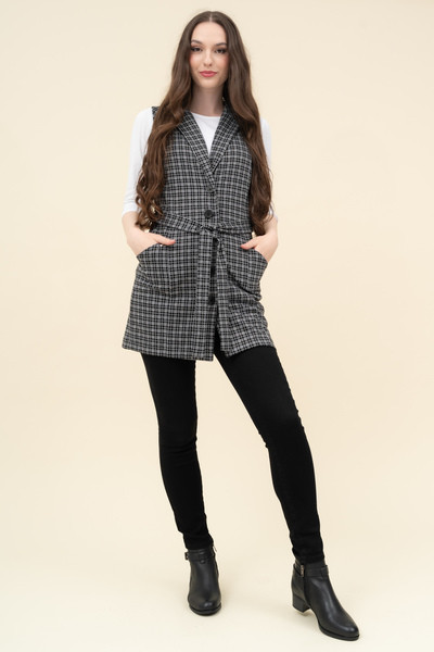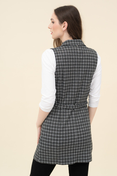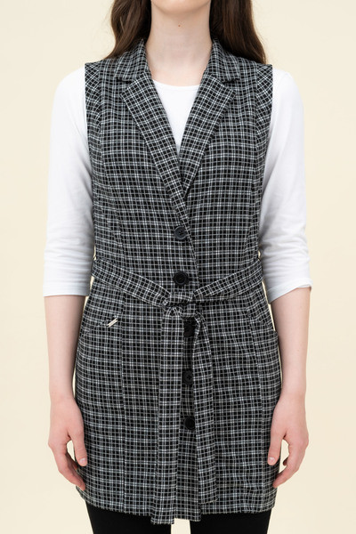 Női hosszított mellényruha rugalmas anyagból. Szűkített fazon. Derekán öv. Fémcímkével díszítve.